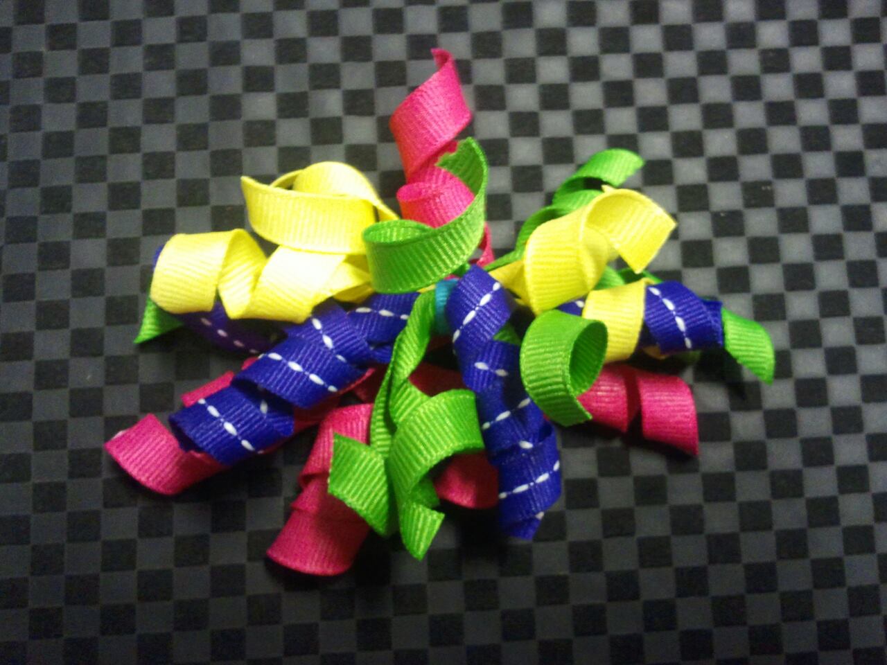 Multicolored ribbon twirls attached to an alligator clip.