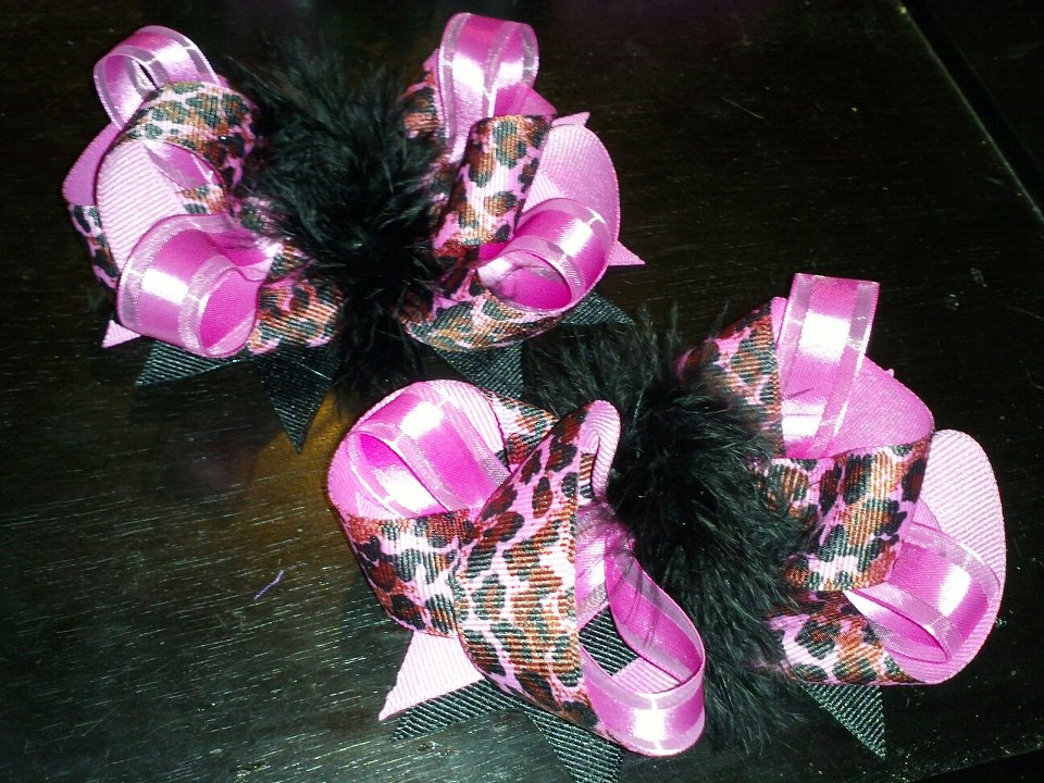 Pink Animal Print with black feather centers. Can be a set of piggie bows for $14 or sold individually for $7