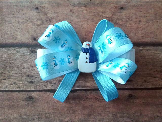 Three Ribbon bow: Light Blue snowman ribbon with Snowman Clay center.